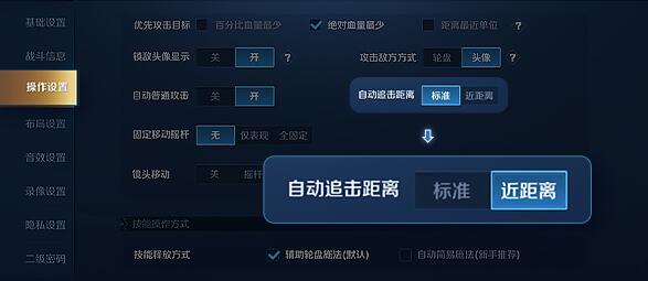 这个设置是在这个赛季才出现的,主要分标准和近距离,这里推荐设置为近距离,设置成近距离的话,就不容易出现普攻鬼畜移动的现象了,方面你玩射手时走A,而若是设置成标准,就是从前的设置,很容易出现走A不自觉的要追击敌人的情况。