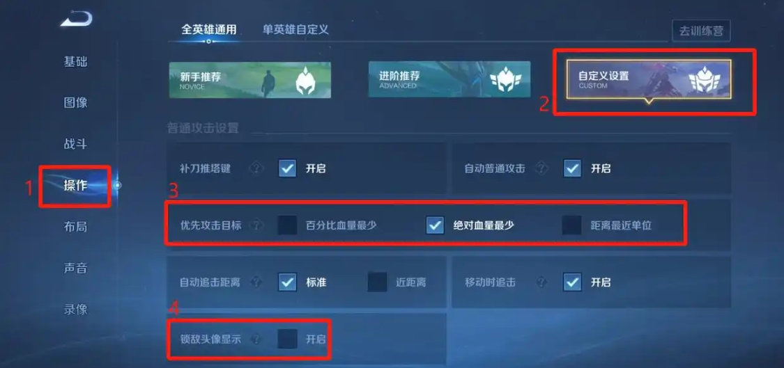 该设置确保普通攻击自动选择当前攻击范围内生命值(HP)数值最低的单位,避免因英雄最大生命值差异导致误判——例如坦克残血40%(4000点)仍高于射手残血20%(800点),系统将精准锁定后者。